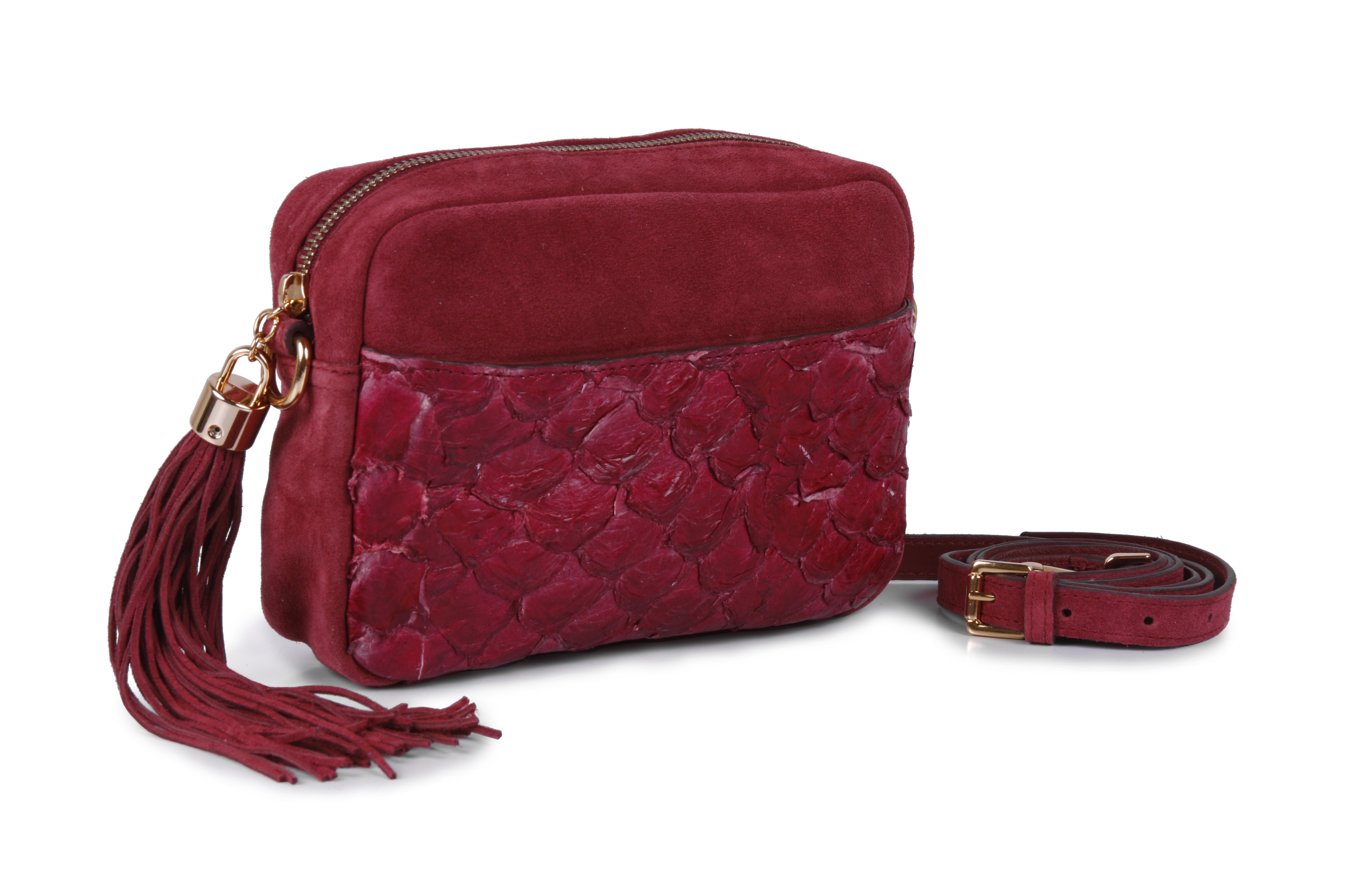 Bolsa retangular em camurça italiana e bolso frontal em pele de Peixe Pirarucu Bordo. Feita a mão de forma artesanal – 100% em couro. Segue os padrões e certificação do IBAMA para preservação das espécies.
