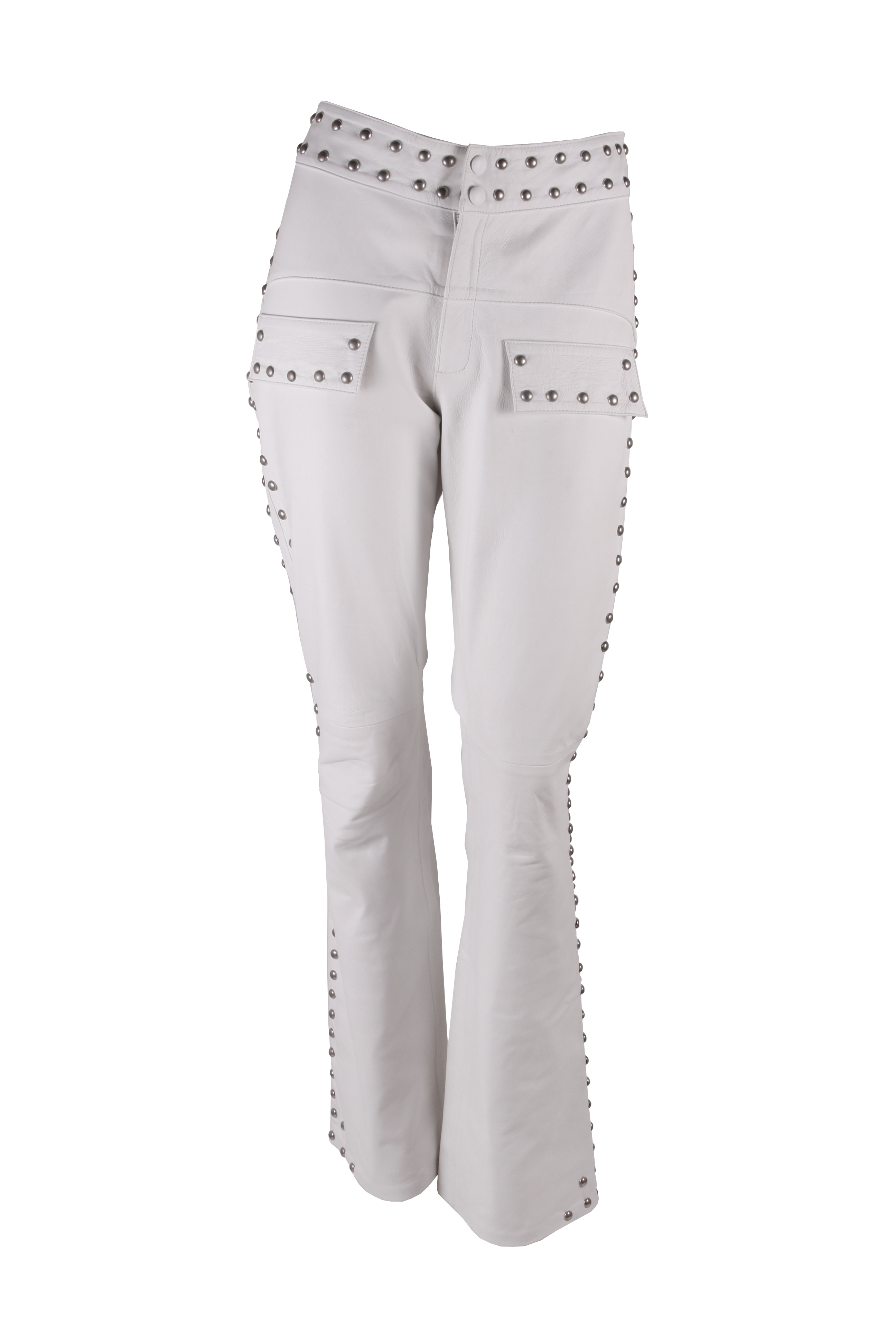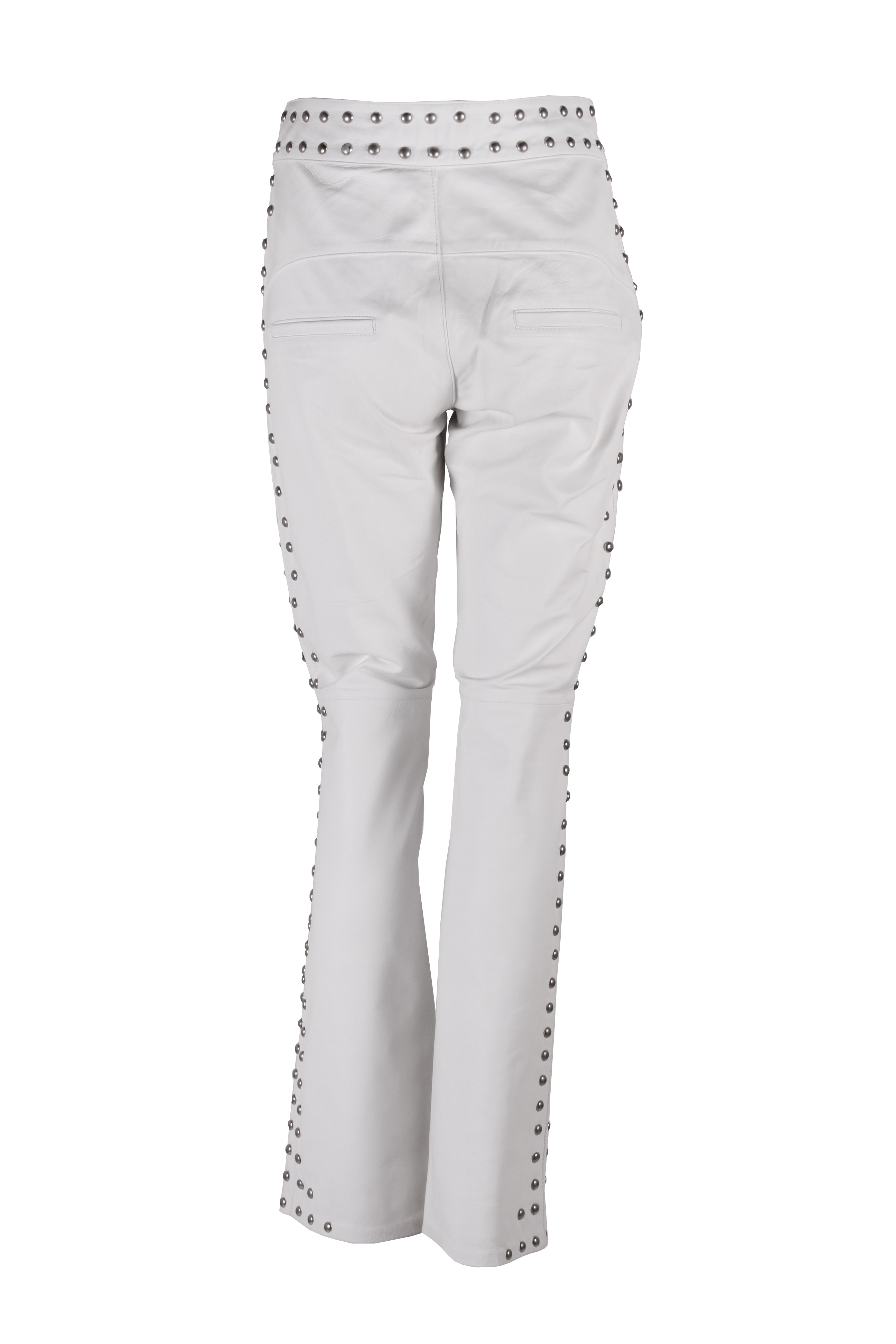 Calça flaire com 150 spikes em pelica branca.