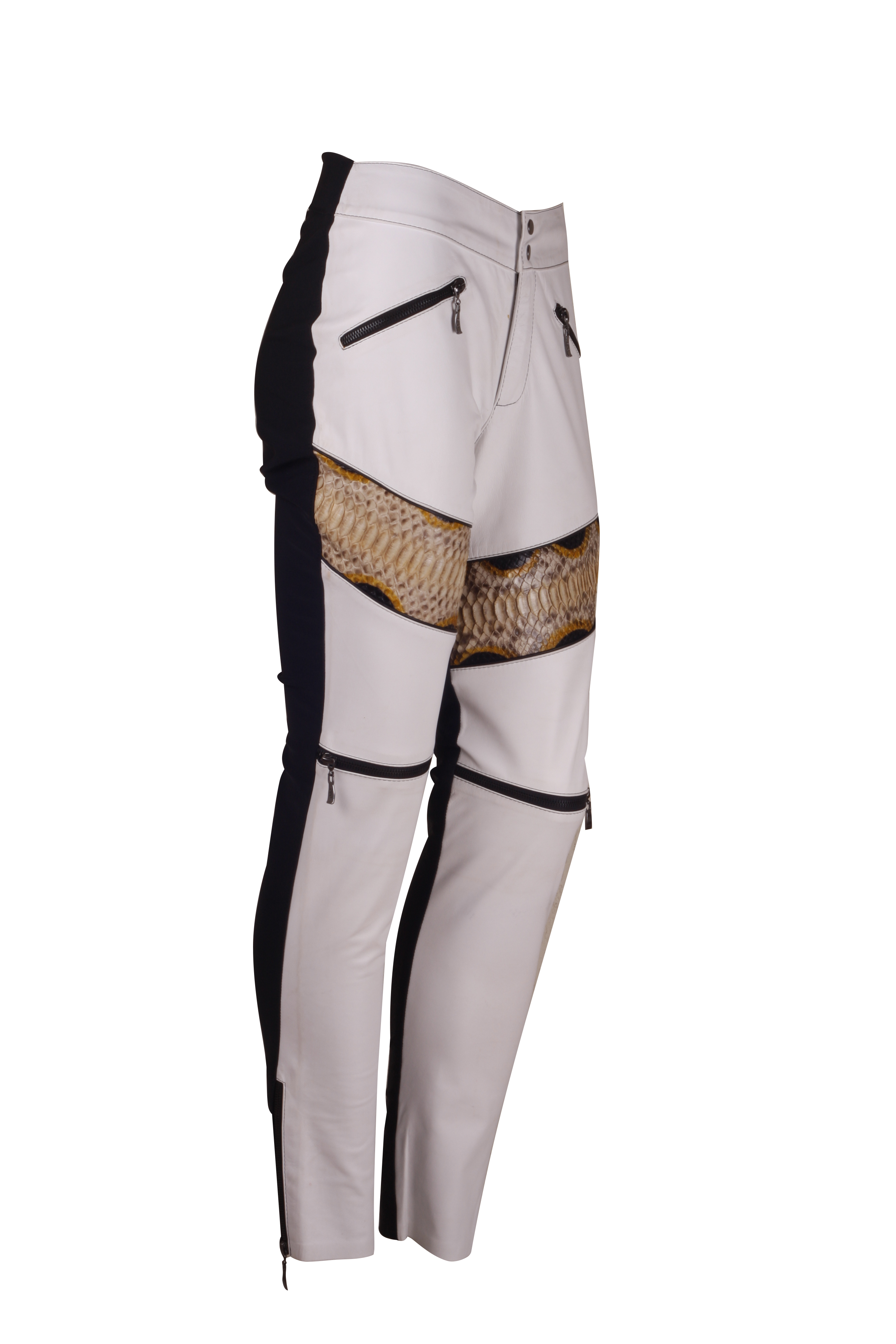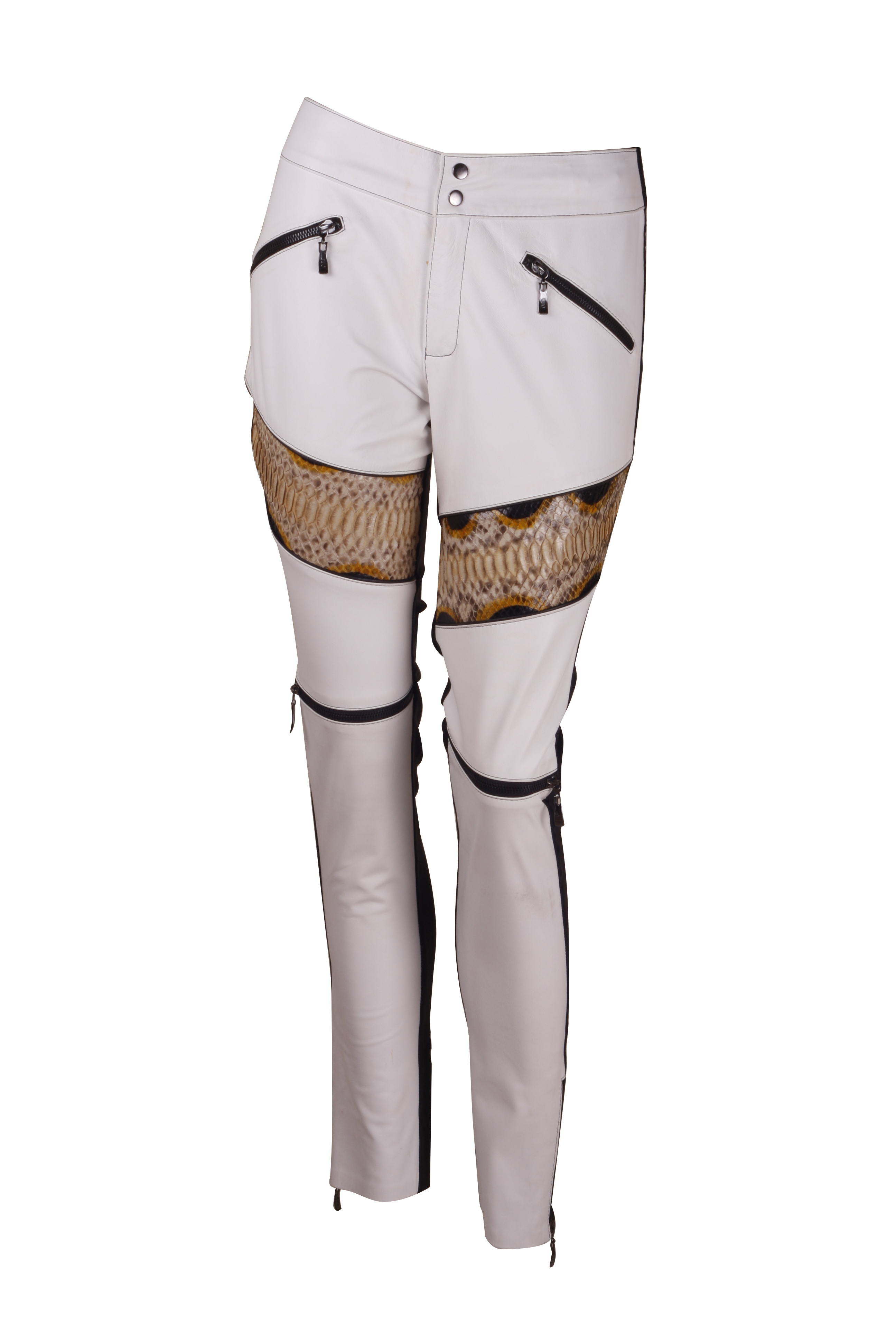 Calça justa, em pele de cabra branca, com detalhe exclusivo na perna de 1/2 metro de cobra python pintada a mão nas tonalidades de Amarelo, preto e Offwhite.