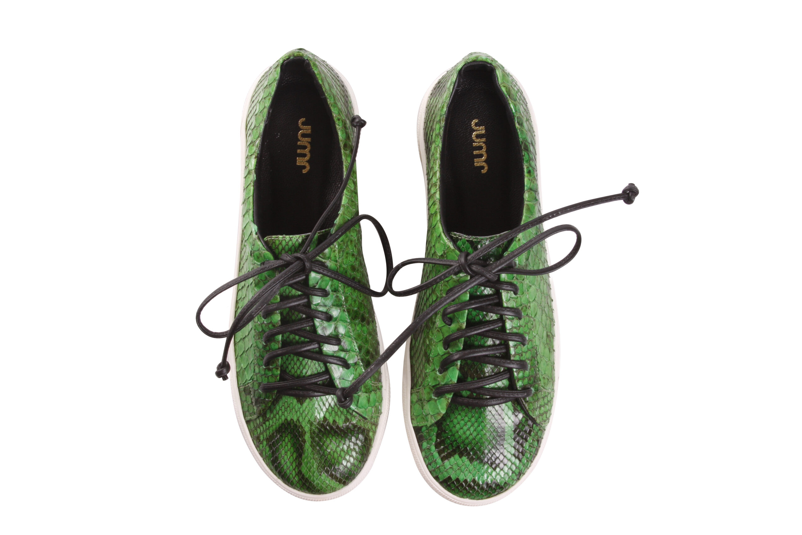 Tênis em cobra Python artesanal pintado à mão em tons de verde e azul. Possui amarração com cadarço em couro natural verde. Sola em borracha branca, seguindo os conceitos internacionais de concepção de referência.