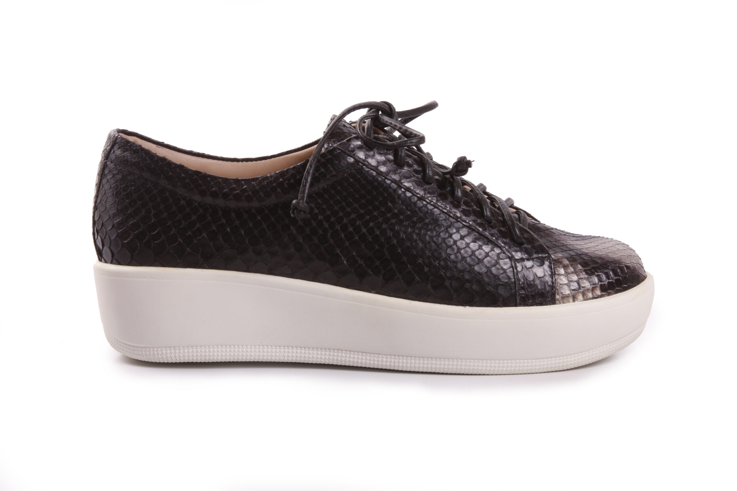 Tênis em cobra Python artesanal pintado à mão Pretoo . Possui amarração com cadarço em couro preto . Sola em borracha branca, seguindo os conceitos internacionais de concepção de referência.