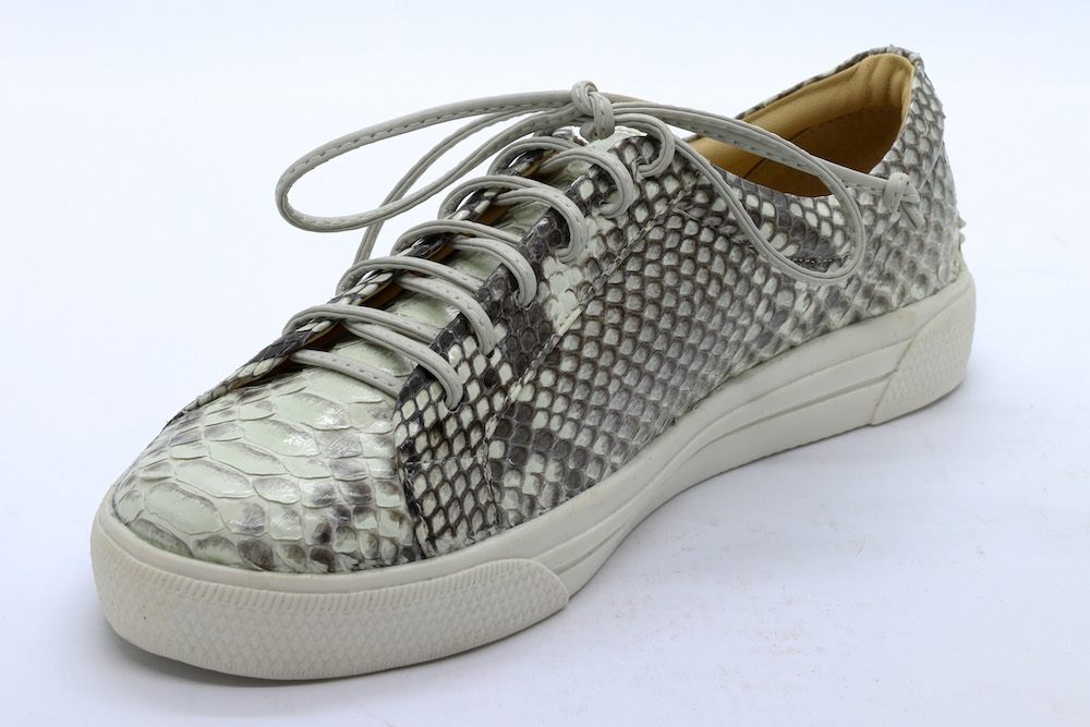 Tênis em cobra Python offwhite, na cor NATURAL da espécie. Possui amarração com cadarço em couro natural offwhite. Sola em borracha branca, seguindo os conceitos internacionais de concepção de referência.